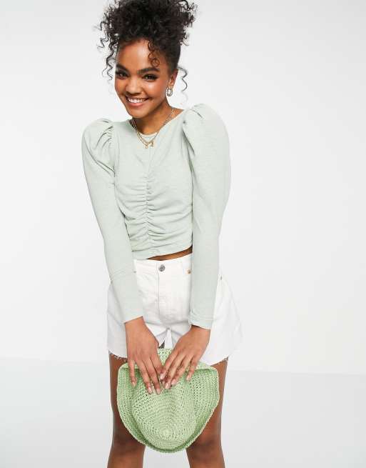 Miss Selfridge Long Sleeve Textured Ruched Front Top in green