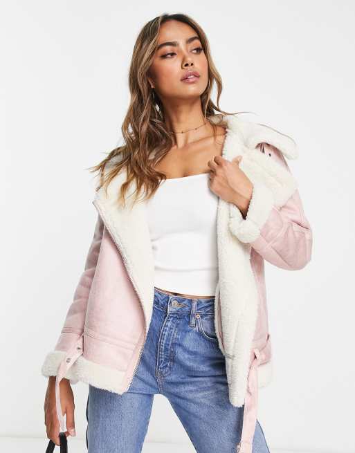 Miss Selfridge longline borg aviator jacket in pink