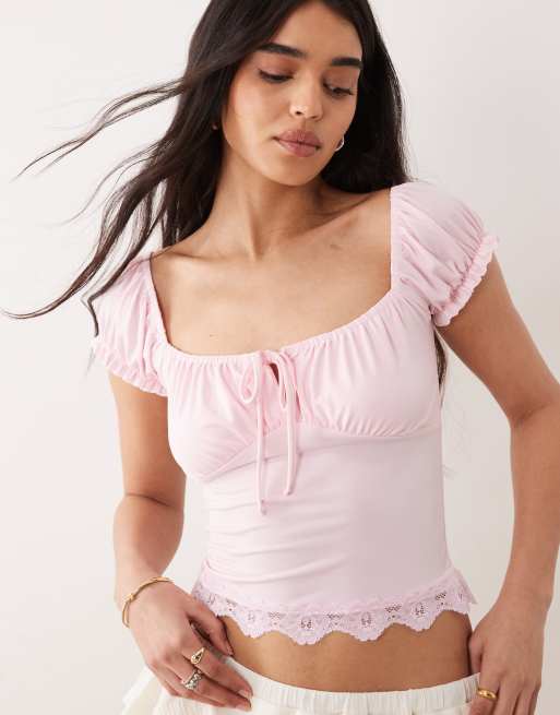 Miss Selfridge milkmaid top with lace hem in pink