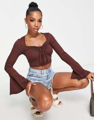 Miss Selfridge neck tie flared sleeved crop top in brown