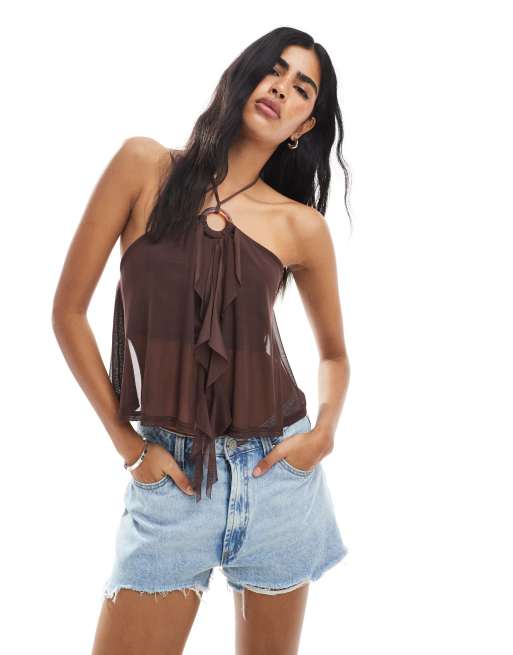 Miss Selfridge o ring ruffle split front top in chocolate