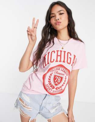 Miss Selfridge oversized graphic front print Michigan t-shirt in pink