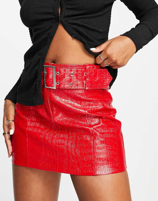 Miss Selfridge patent croc mid rise belted mini skirt in red