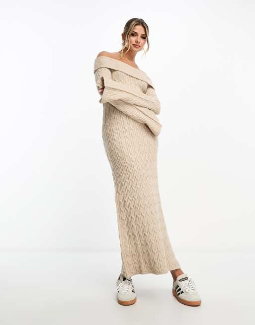 Miss Selfridge rib chunky foldover bardot knit maxi dress in oatmeal