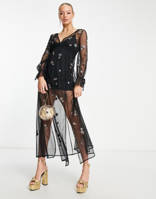 Miss Selfridge sequin star sheer mesh maxi dress in black