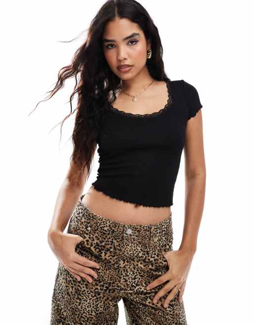 Miss Selfridge short sleeve pointelle scoop tee with lace trim detail in black
