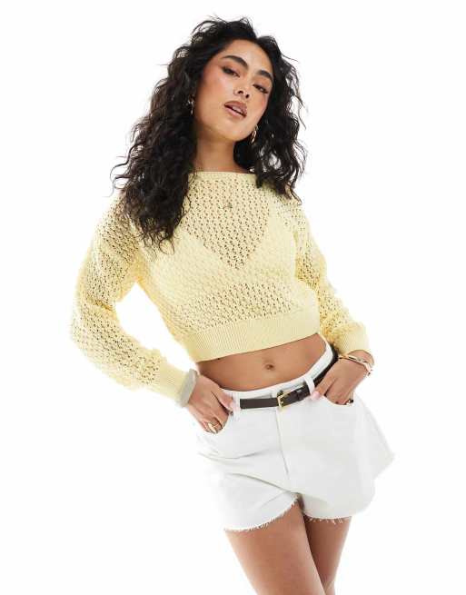 Miss Selfridge slash neck crochet long sleeve top in lemon
