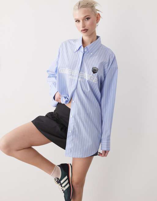 Miss Sixty oversized long sleeve shirt in light blue pinstripe with sport badging