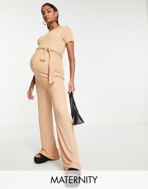 Missguided Maternity wide leg jumpsuit with short sleeve in camel
