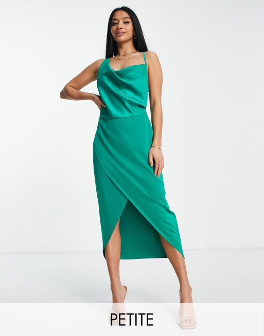 Missguided Petite asymmetric drape dress in jade green satin