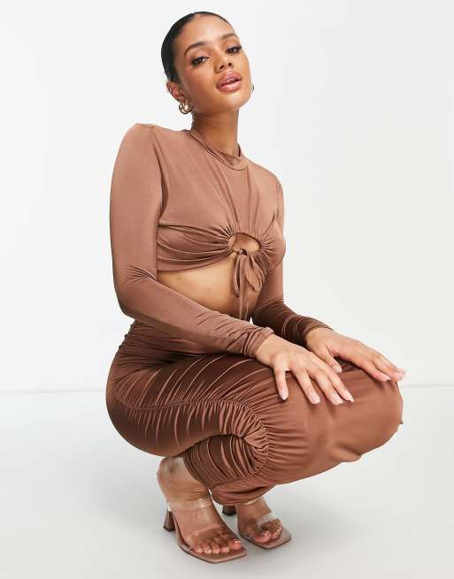 Missguided co-ord top and slinky ruched midi skirt in brown