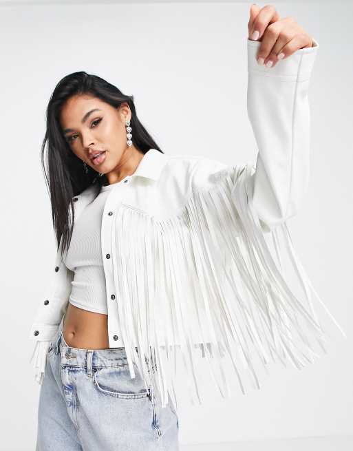 Missguided crop western trucker jacket with fringe detail in white faux leather