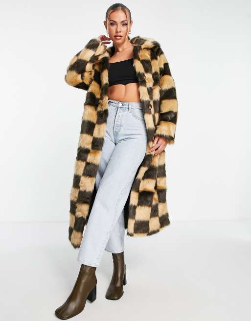 Missguided faux fur colour block coat in chocolate