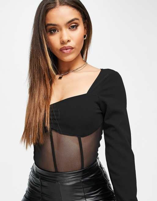 Missguided square neck bodysuit with mesh panel in black