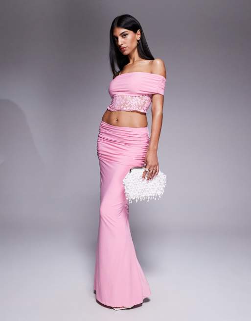 Missyempire double sculpted slinky ruched side detail maxi skirt co-ord in pink