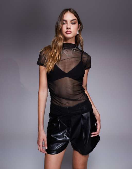 Missyempire sheer mesh cap sleeve ruched side top in black