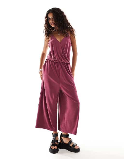 Monki drapey wide leg cami jumpsuit with wrap front in dark red