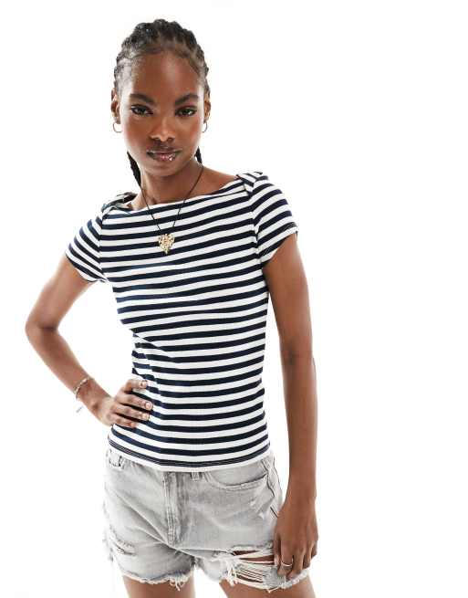 Monki fitted short sleeve top with boat neck in navy and white stripe