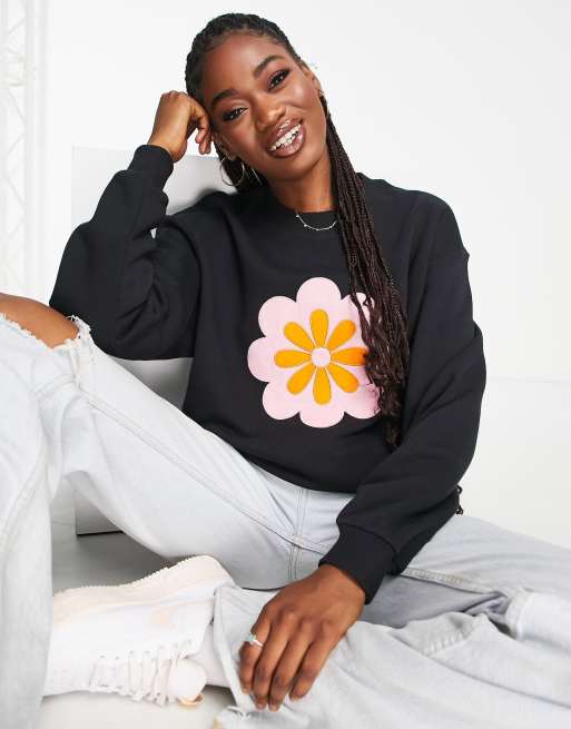Monki flower print sweatshirt in black