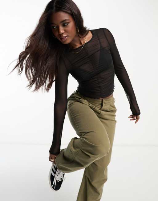 Monki gathered front mesh top in black