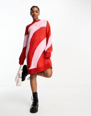 Monki knitted jumper mini dress in red and pink wavy stripe