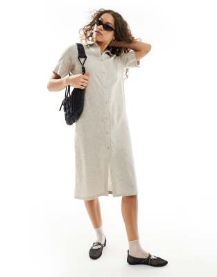 Monki linen blend midi shirt dress with button front in beige