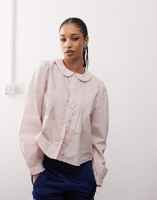 Monki long sleeve frill collared shirt blouse in light dusty pink