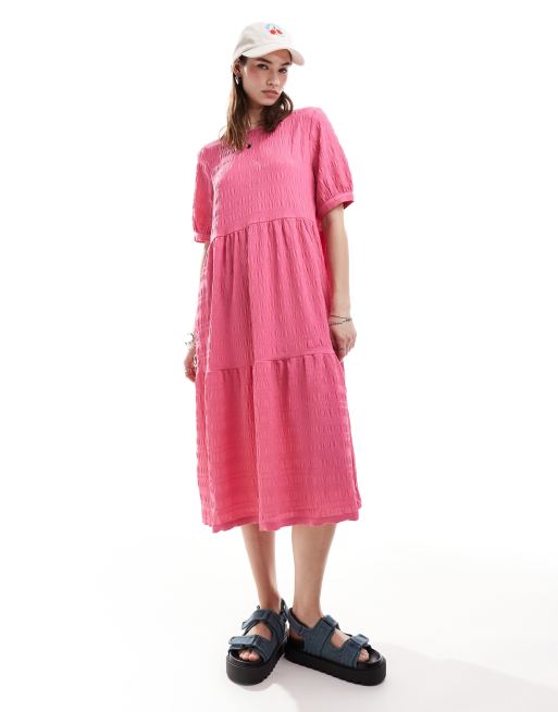 Monki midi smock dress with tiered hem in pink