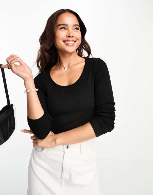 Monki scoop neck skinny rib long sleeve top in black