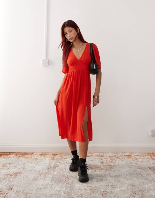 Monki short sleeve midi dress with side split in red
