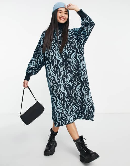 Monki swirl jacquard turtleneck knitted midi dress in blue - MBLUE