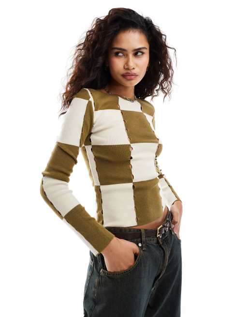 Moon River checkerboard hole-knitted ribbed top in olive