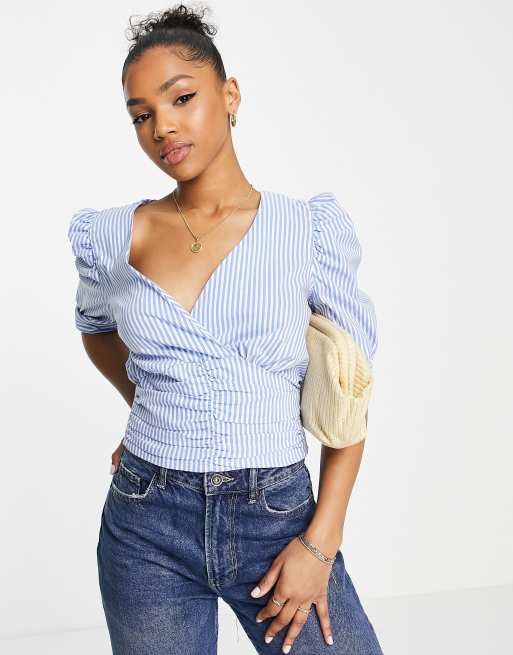 Morgan stripe wrap front top in blue