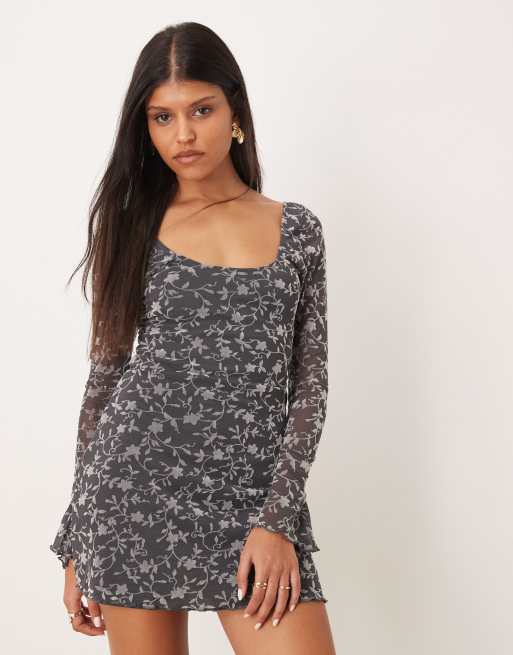 Motel bindara long sleeve mesh overlay mini dress with low back in floral dark grey