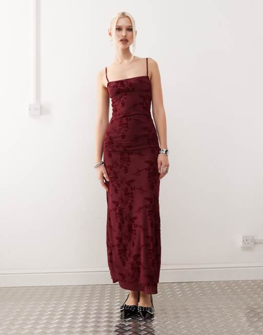 Motel darsih flocked floral maxi cami dress in burgundy