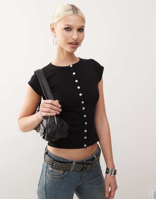 Motel elmira button through flat knit top in black