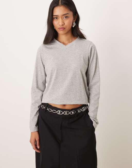 Motel Feman long sleeve v neck casual top in grey marl
