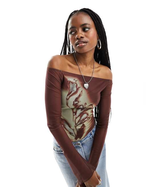 Motel flower print mesh long sleeve off shoulder top in rust