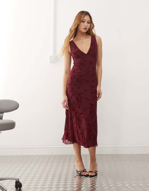 Motel gabriela flocked floral v-neck midi dress in burgundy