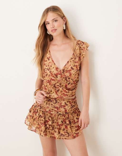 Motel heidi chiffon floral print wrap co-ord top in rust