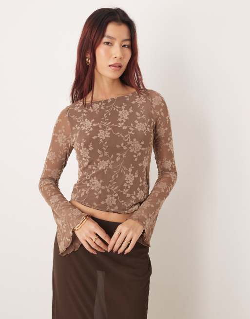 Motel Lakya long sleeve leafy flock top in dark taupe