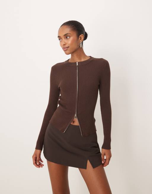 Motel Liano ribbed long sleeve zip up cardigan in brown