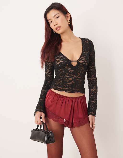 Motel Mahota deep plunge long sleeve lace top in black