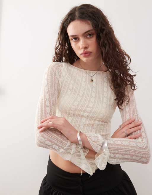 Motel Malakai asymmetric long sleeve lace top in ivory