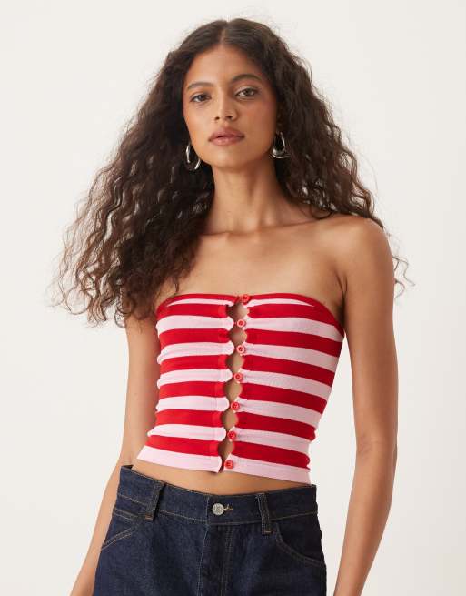 Motel sarella knit stripe button detail top in pink and red