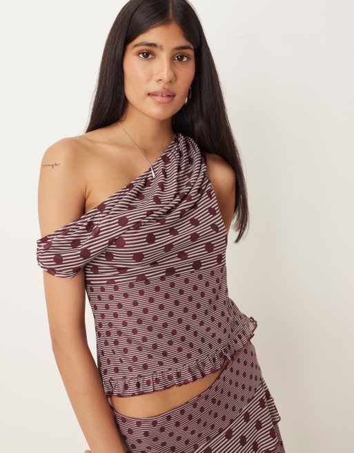 Motel Tarya off shoulder co-ord polka dot mesh top in plum