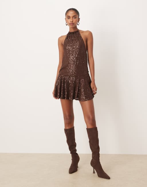 Motel veloria halterneck drape mini dress in brown sequin