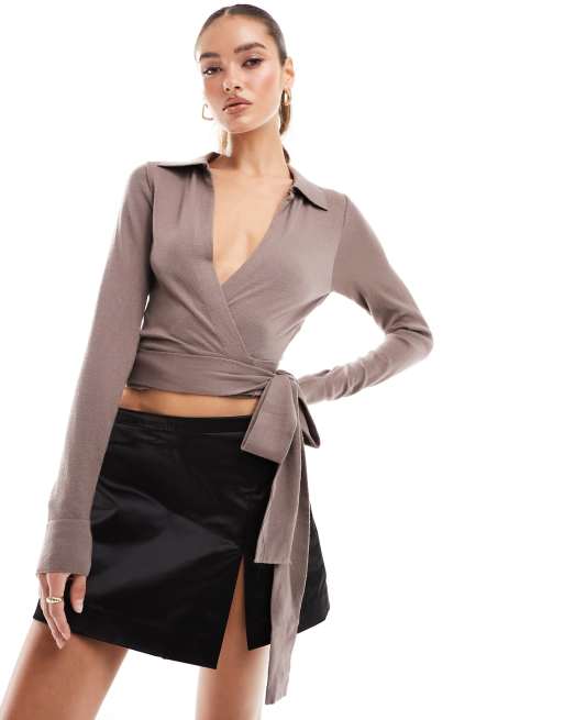 NA-KD knitted wrap around top in taupe