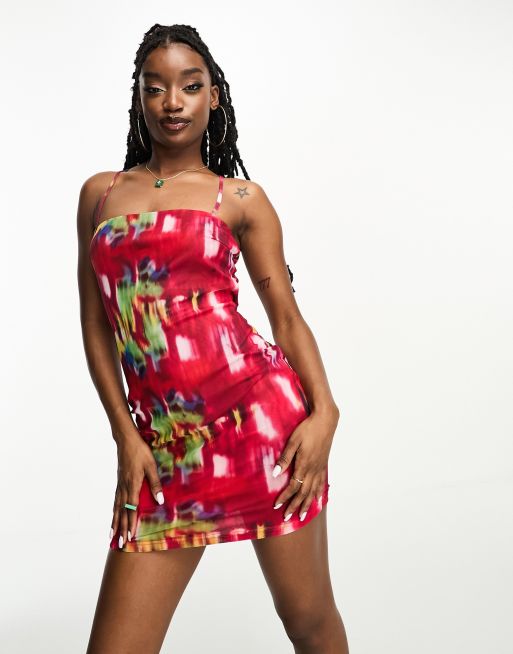 NaaNaa cami bodycon dress with tie back detail in red abstract print