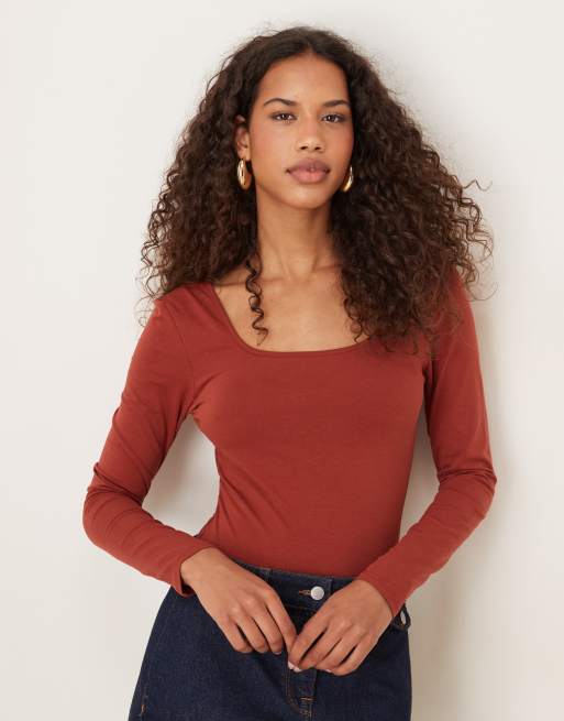 Narrated Long sleeve bodysuit with rounded square neck in umber